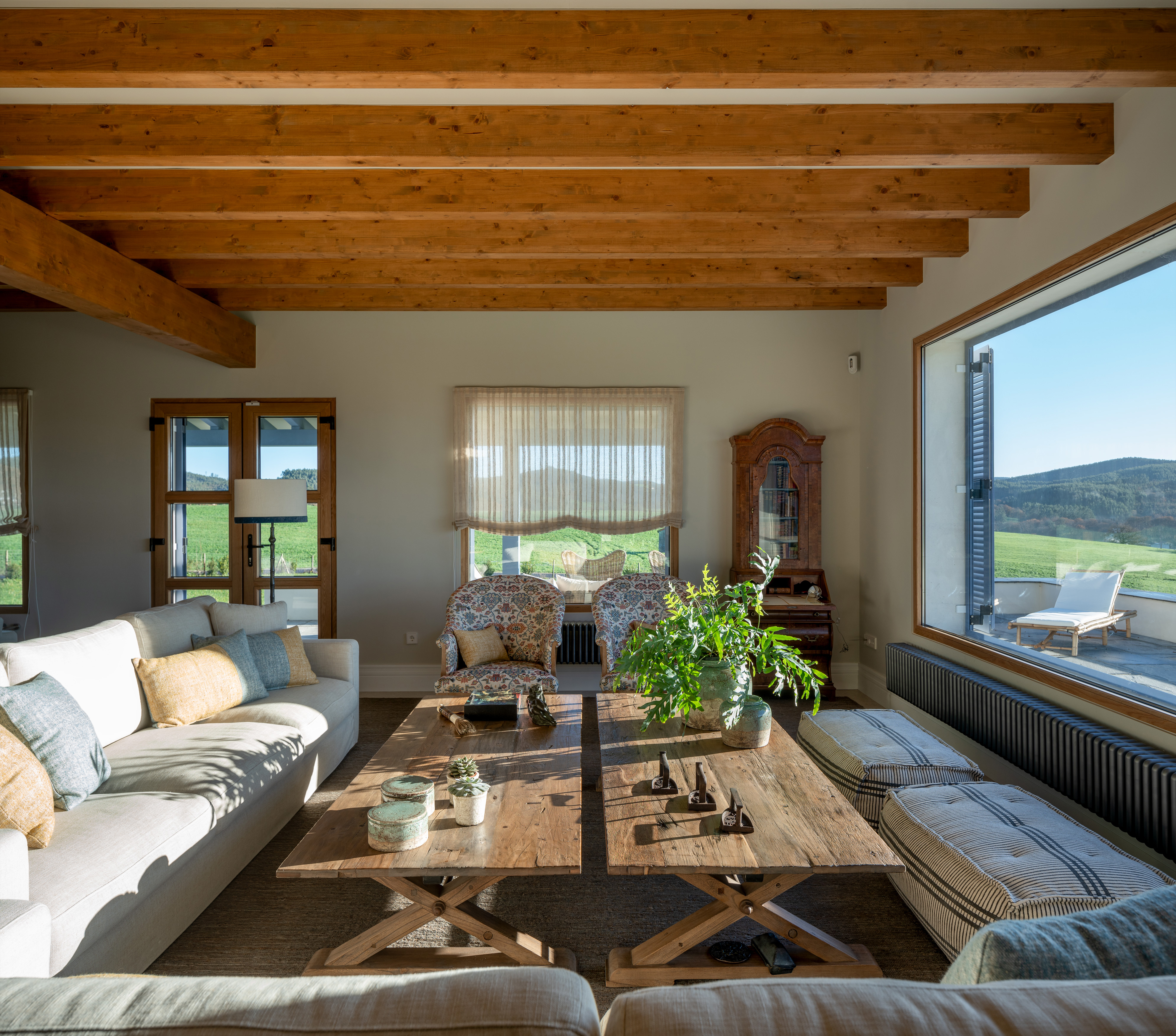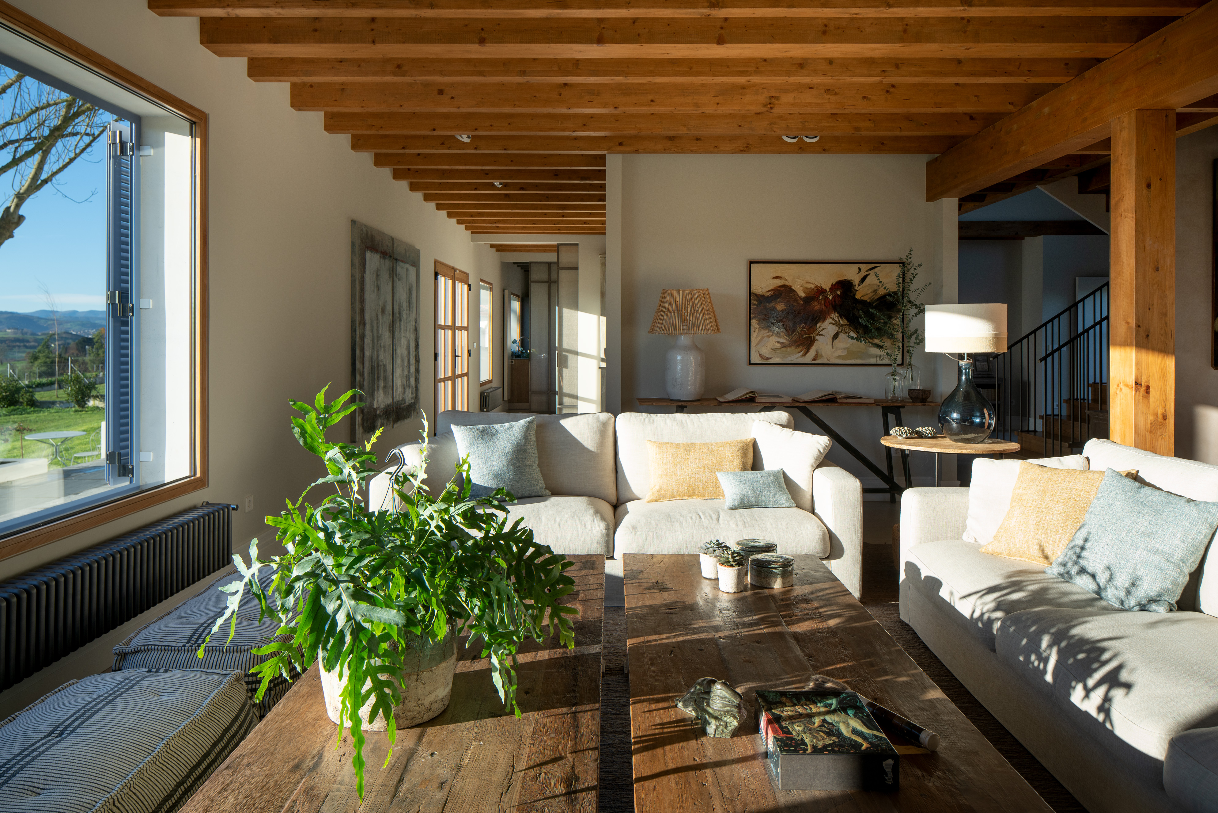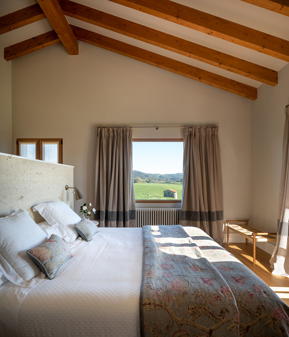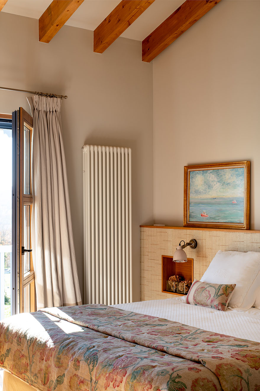 Tutte le camere mantengono uno stile country moderno che conserva gli elementi originali della casa, come le travi in legno presenti in tutta la casa e li combina con pezzi moderni che si integrano senza perdere l'essenza del luogo.