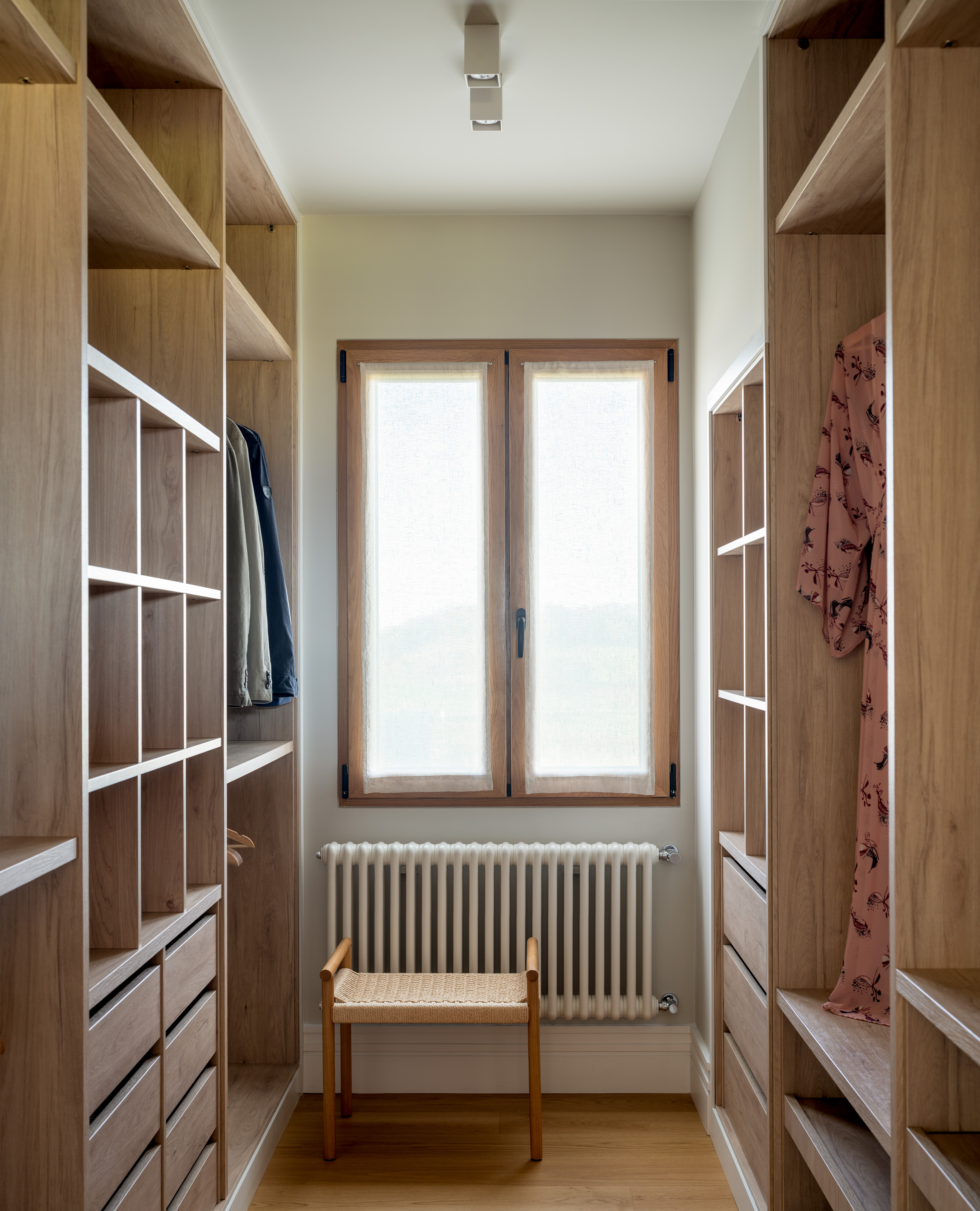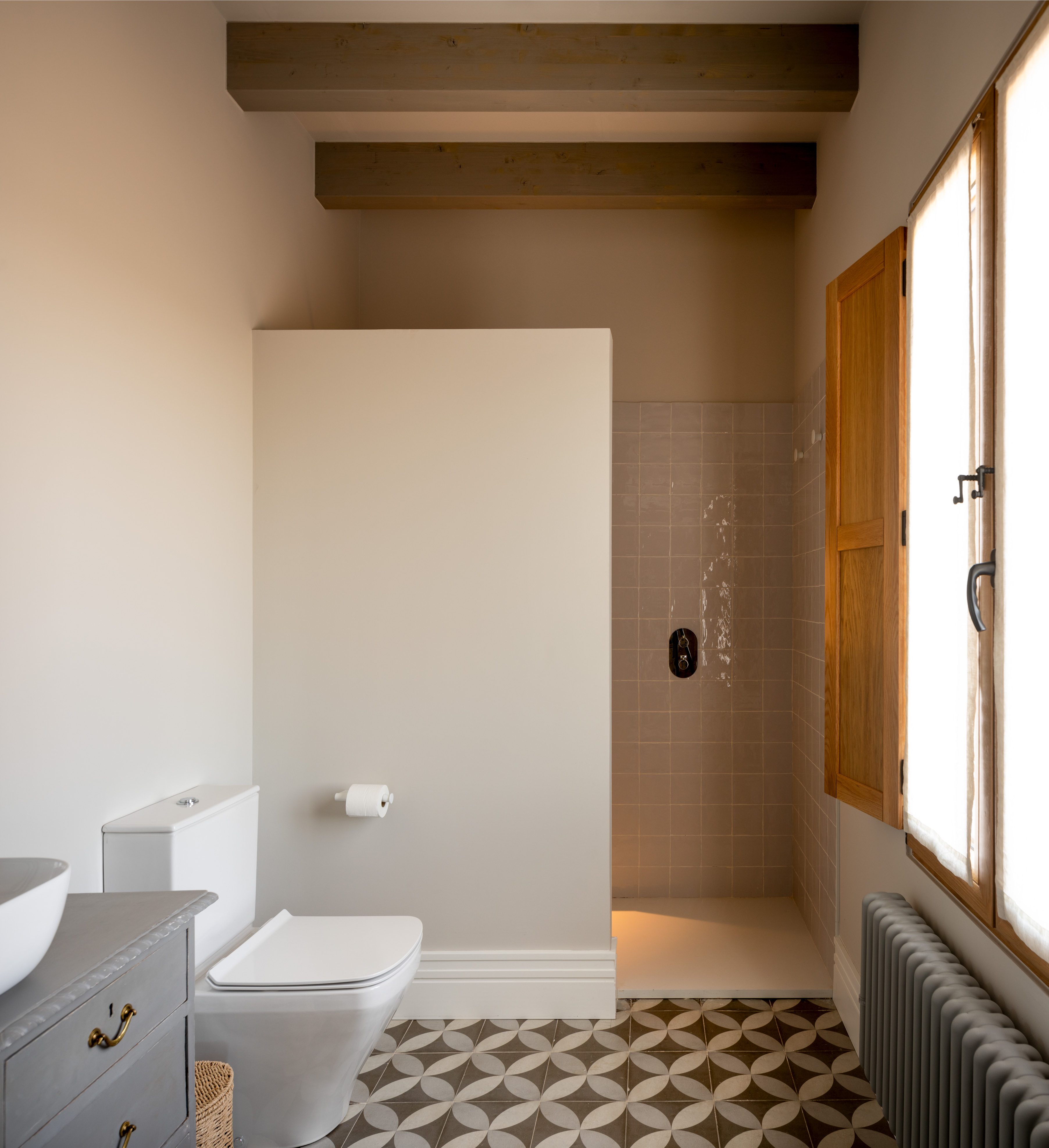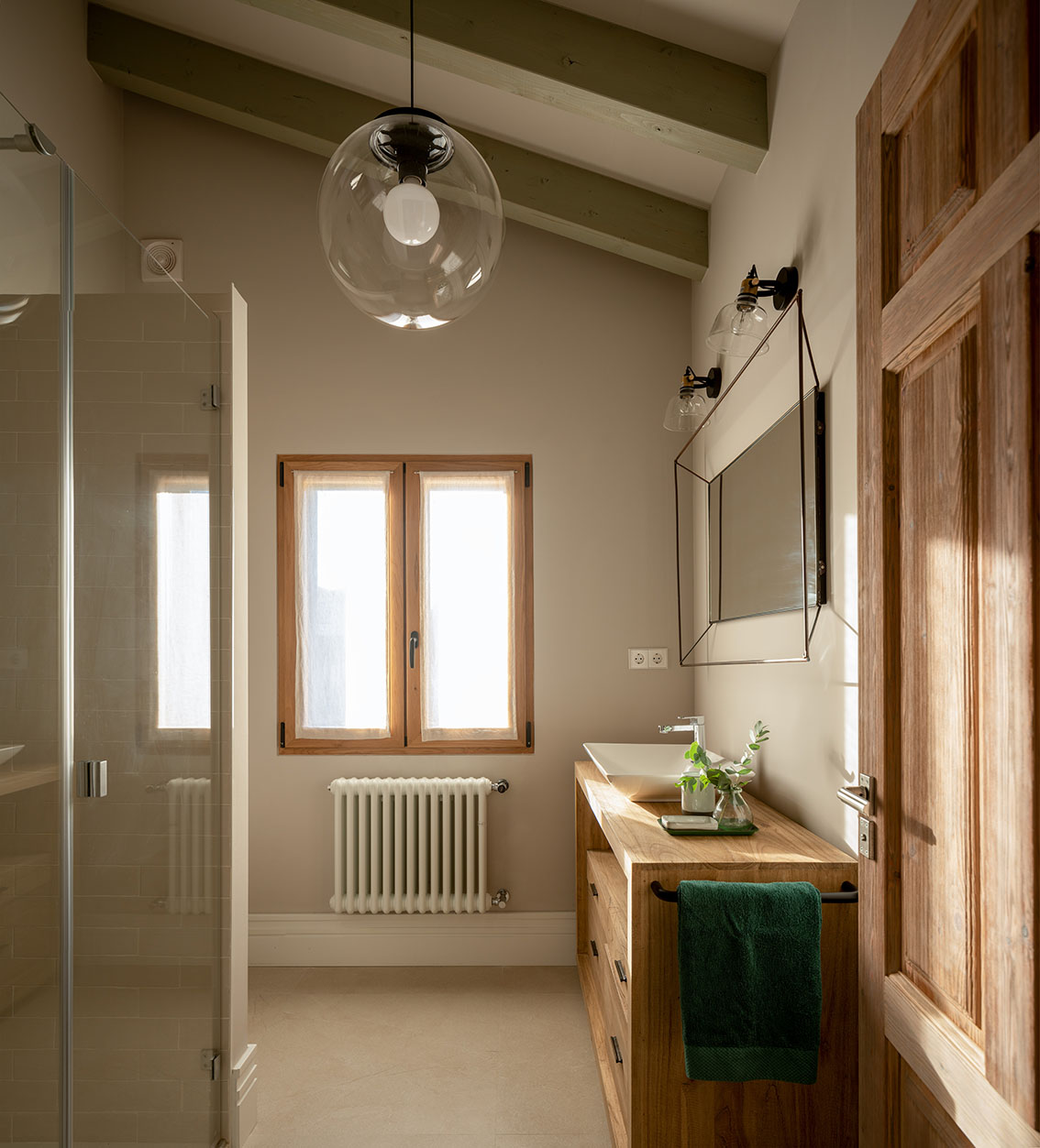 Tutte le camere mantengono uno stile country moderno che conserva gli elementi originali della casa, come le travi in legno presenti in tutta la casa e li combina con pezzi moderni che si integrano senza perdere l'essenza del luogo.