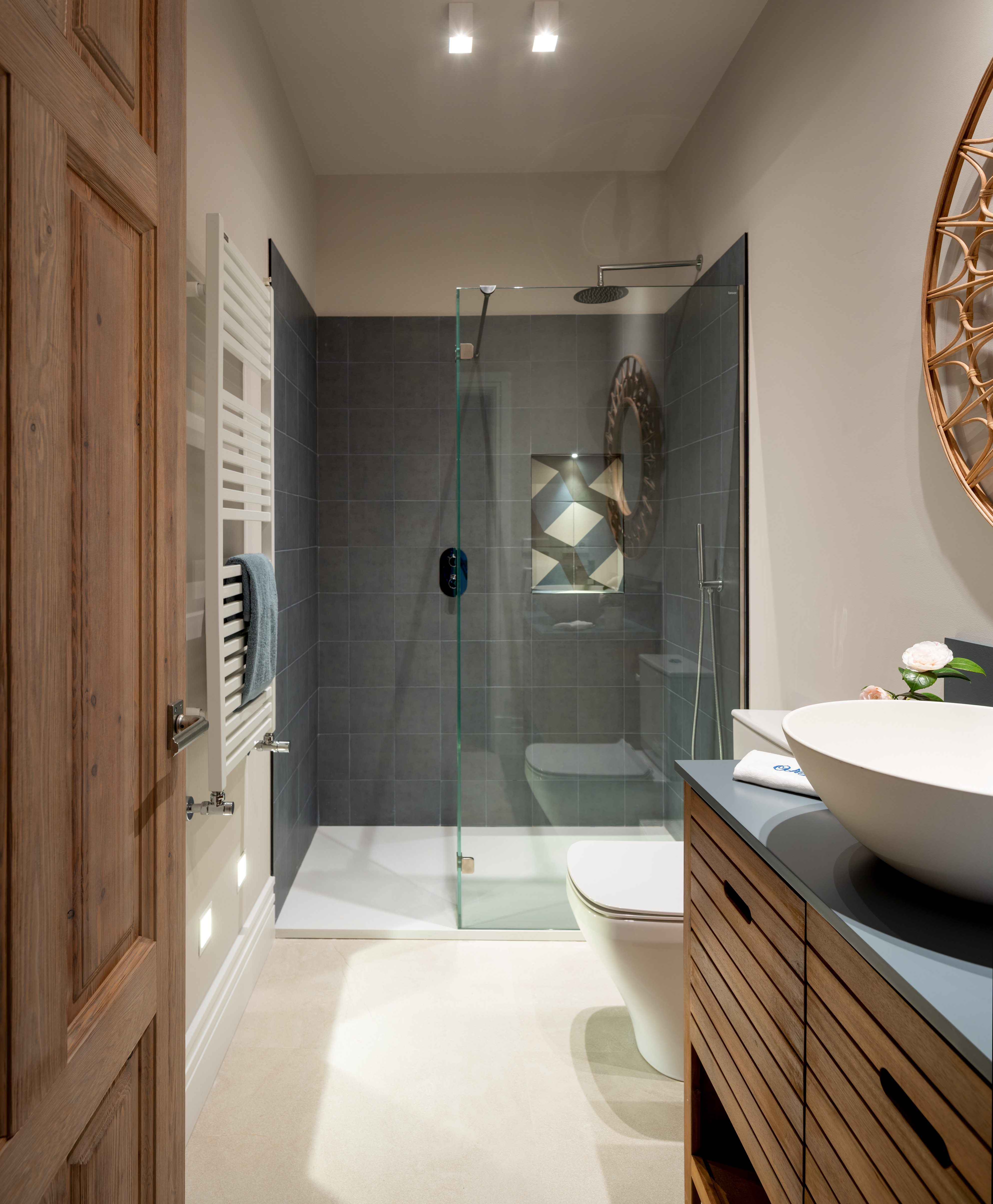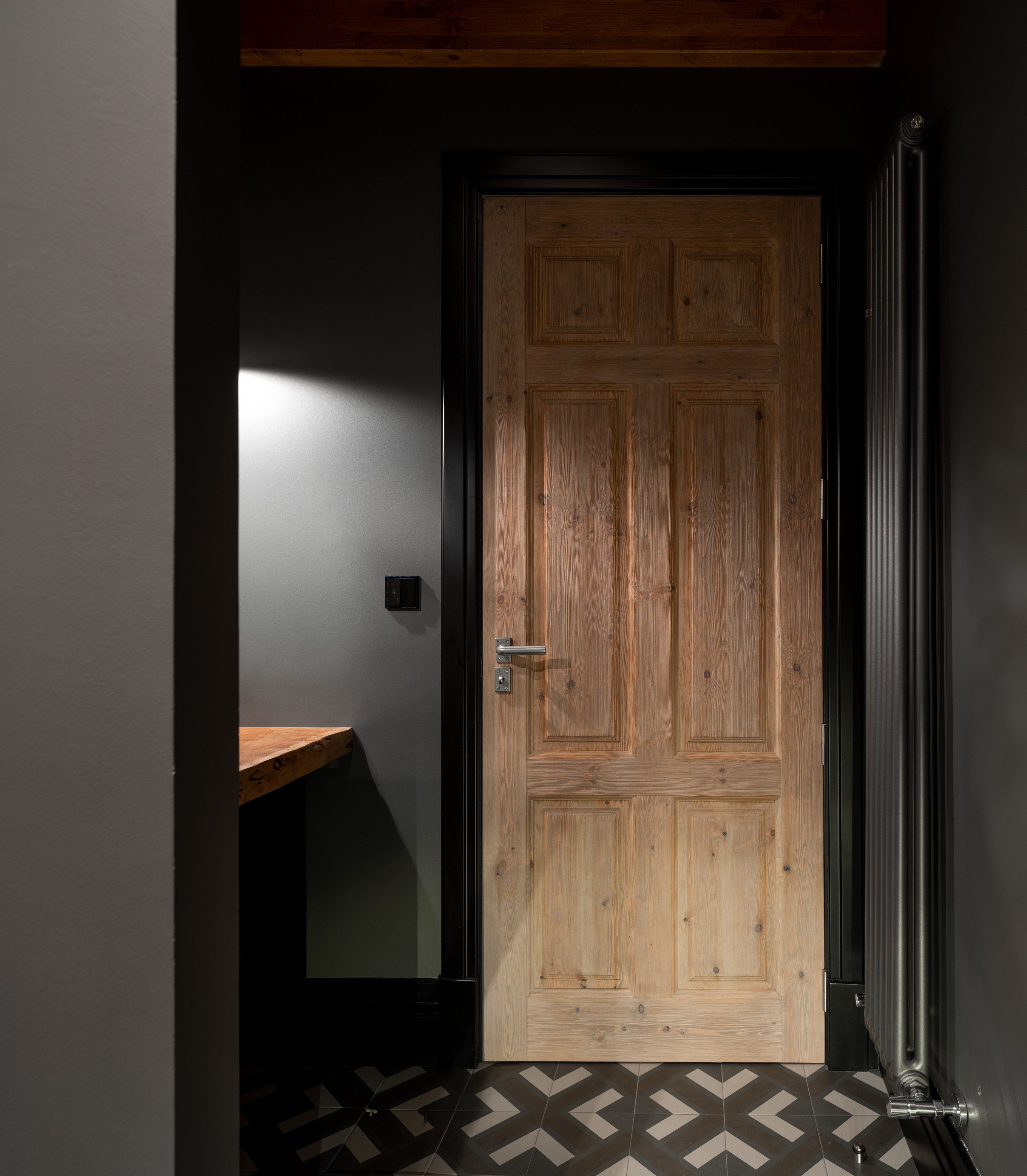 Il bagno per gli ospiti è caratterizzato da pareti grigio scuro e da un'illuminazione piacevole e pratica. Un piano in legno di acacia è stato installato per supportare il lavabo. Anche negli altri bagni si trovano lavabi simili e sono posizionati su mobili diversi, conferendo a ogni spazio un carattere unico.