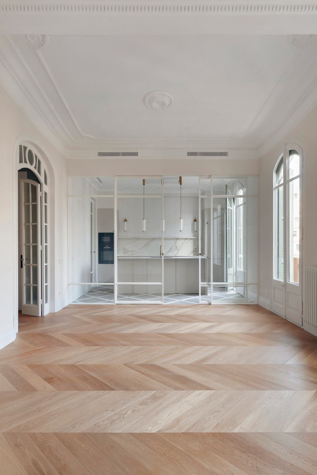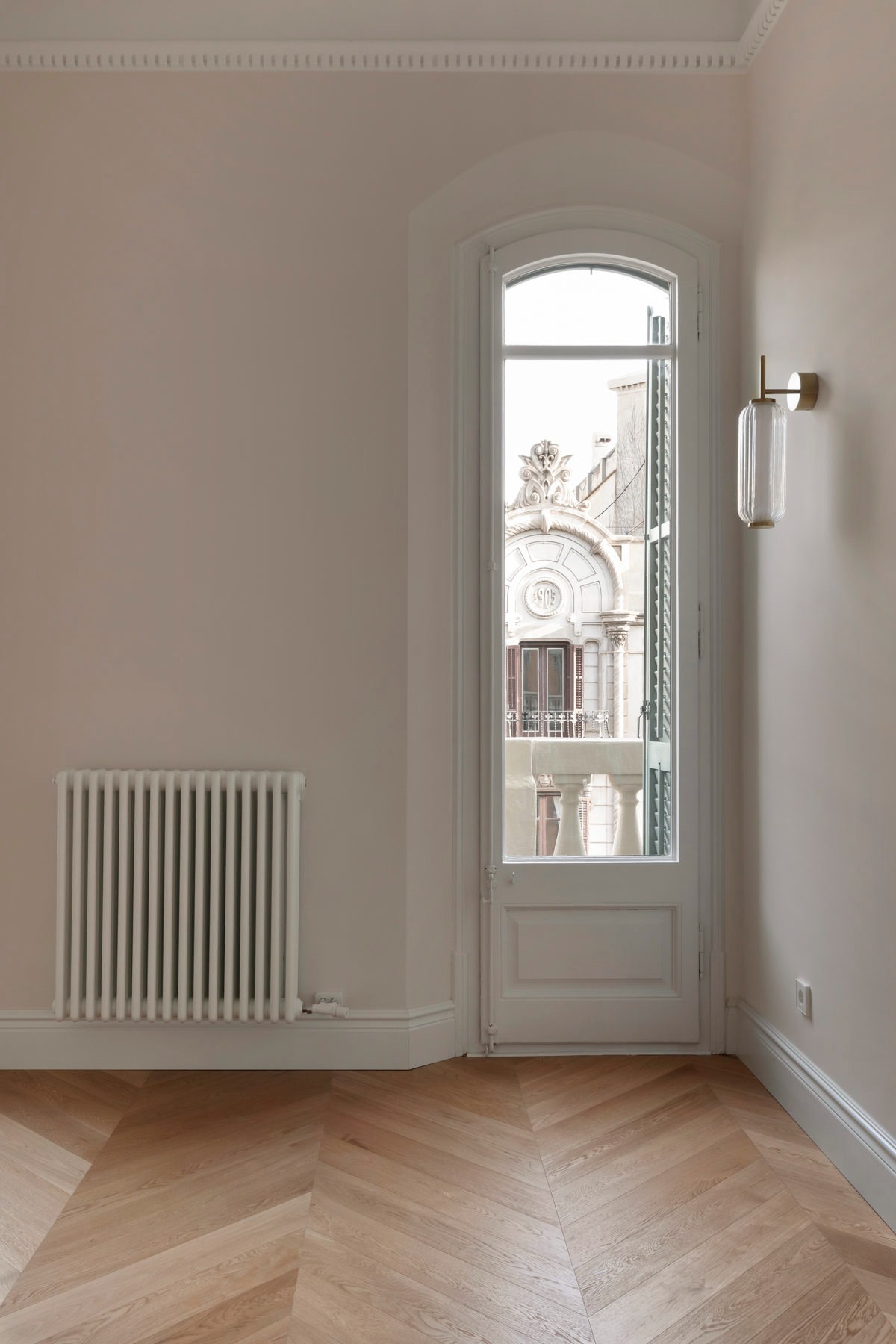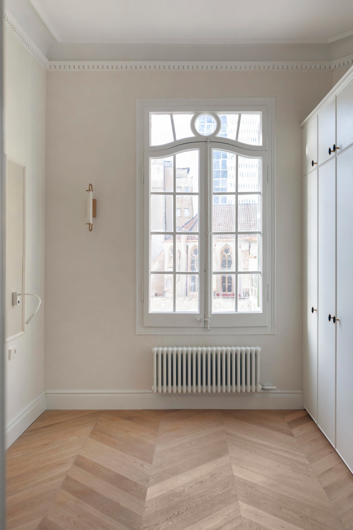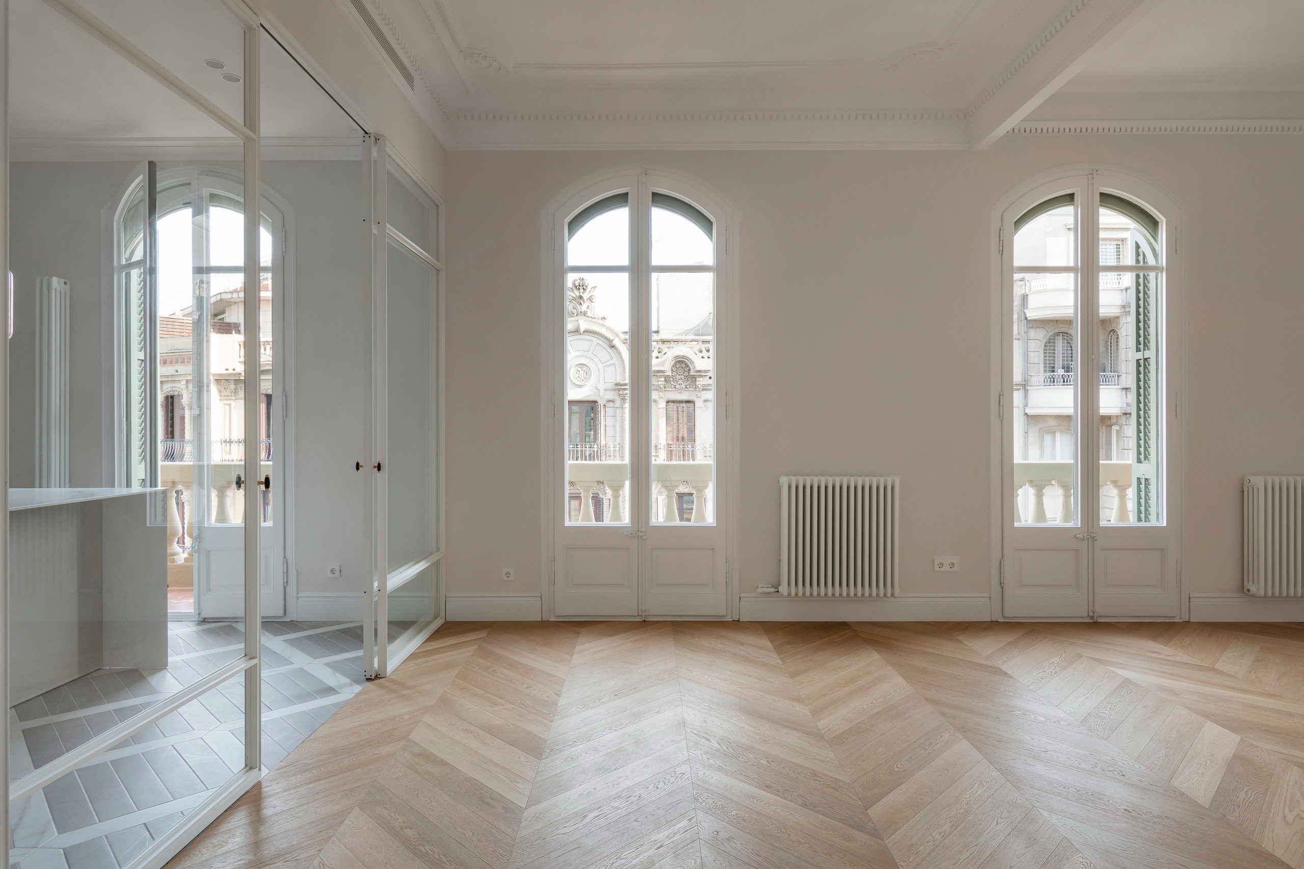 The house, a unique building located in the heart of Barcelona, features spacious, bright rooms with ceilings over 3 meters high, where moldings and cornices were preserved to maintain its original character.